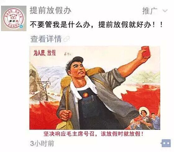 聽說最近微信很火,他們就成立了“提前放假辦”,幾分鐘內就湊夠了500W,馬上投了一個朋友圈廣告。據說是基于大數(shù)據投放的,只有老板和企業(yè)高管才會看到,想想也是醉了。